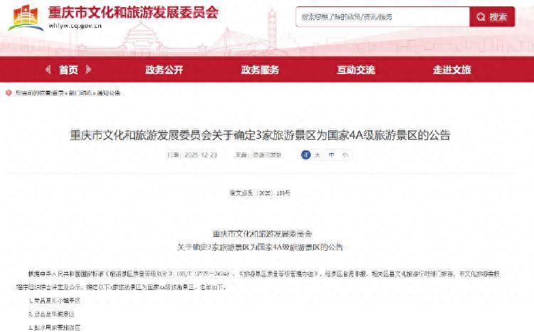 据悉,此次评定根据中华人民共和国国家标准《旅游景区质量等级划分》(GB/T 17775—2024)、《旅游景区质量等级管理办法》,经景区自愿申报,相关区县文化旅游行政部门推荐,市文化旅游委按程序组织综合评定及公示,确定上述3家景区为国家4A级旅游景区。